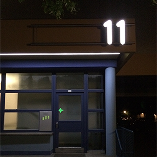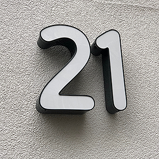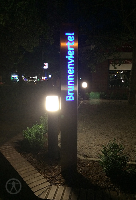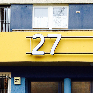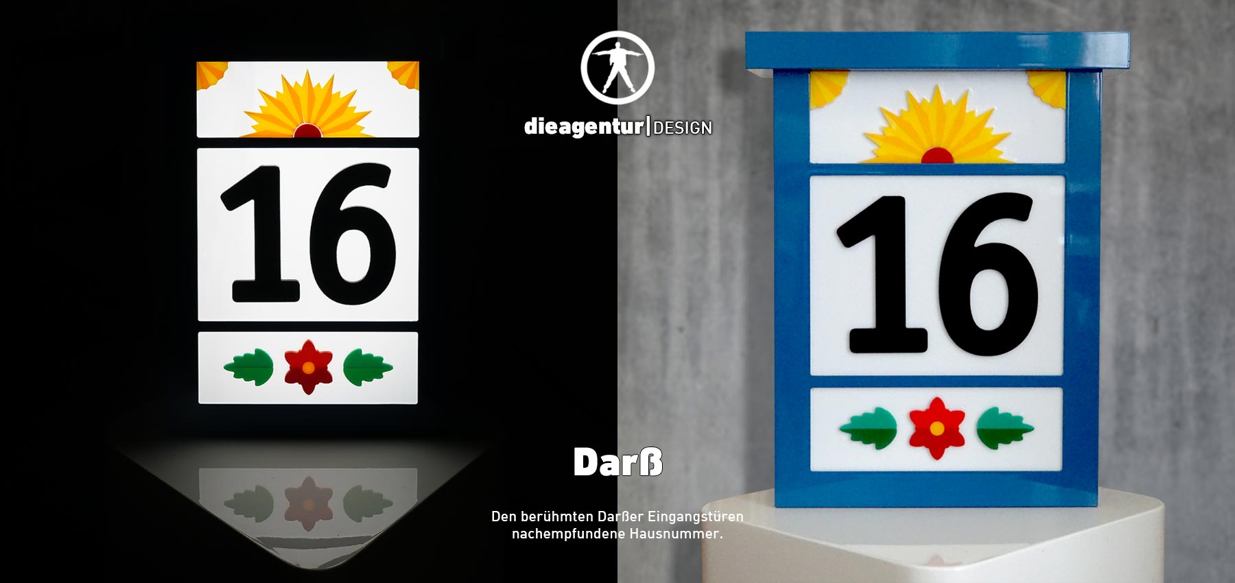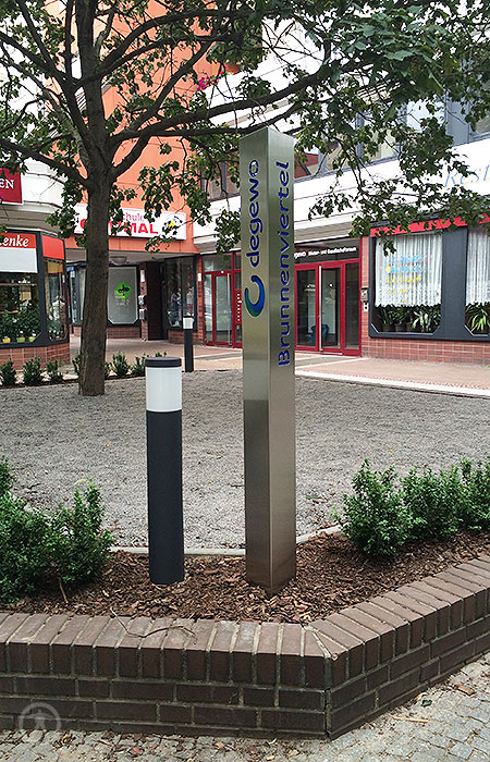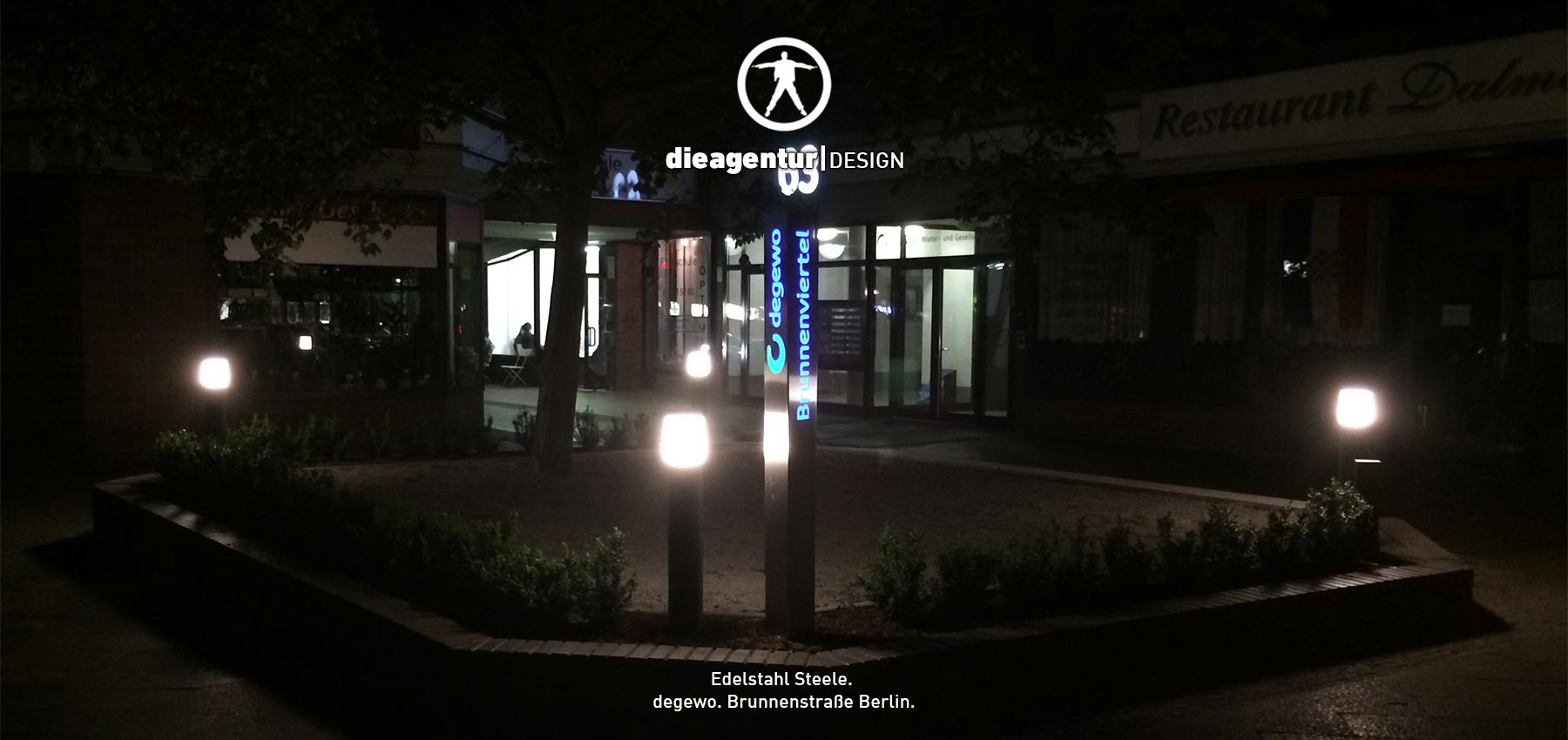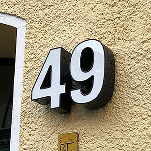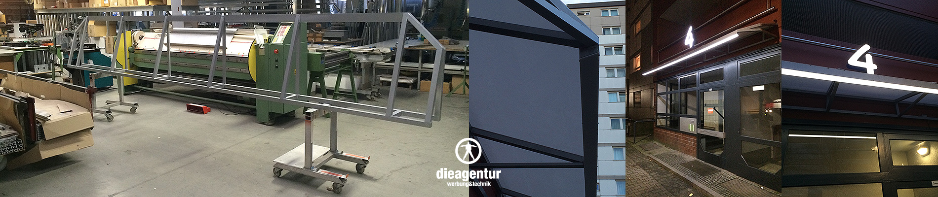 Links war der Originalzustand. Hergestellt & montiert haben wir eine Edelstahlkonstruktion mit einer Gesamtlänge von 6.000 mm, die Höhe beträgt ca. 500 mm. Die aufgesetzte Zahl besteht aus Aluminium, RAL Blau lackiert, Plex Weiss mit einer Höhe von ca. 600 mm.