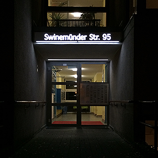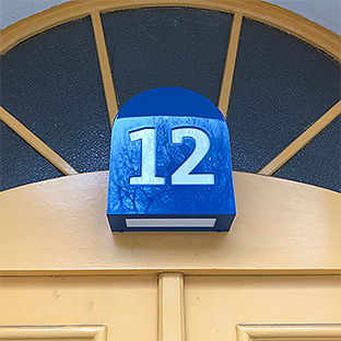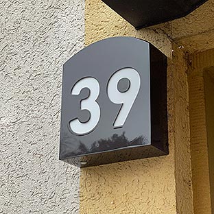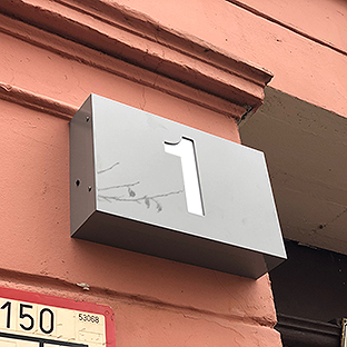 Das Vordach besteht aus lackiertem Aluminum mit integriertem LED-Lichtfluter. Als Abdeckung haben wir weißtransluzentes Macrolon verwendet.